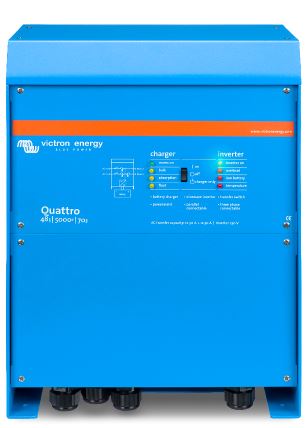 el inversor Quattro es un aparato compuesto de un inversor y un cargador. Además, admite dos entradas CA y se conecta automáticamente a la entrada activa. Sus muchas características incluyen un inversor de onda sinusoidal pura, carga variable, tecnología PowerAssist híbrida, además de múltiples características para su integración en distintos sistemas, como sistemas trifásicos o de fase dividida.